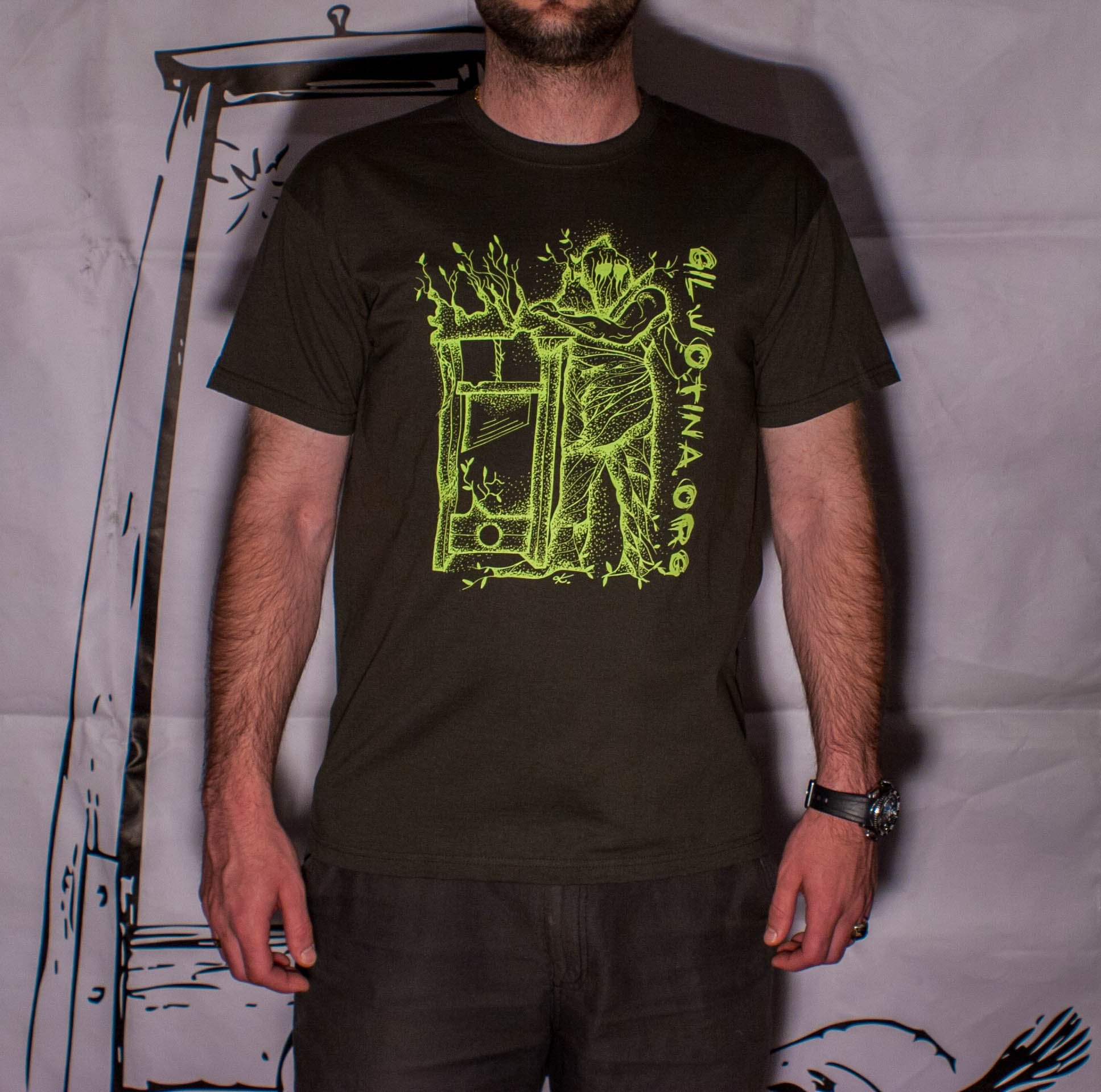 "The Guillotine of Life" T-Shirt. Design by Karen Turcin. 100% cotton light graphite shirt w/ green ink.
